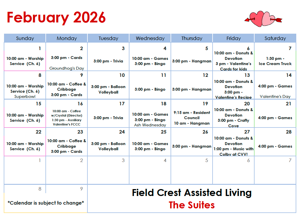 Click here to download a PDF of the February Suites activity calendar.